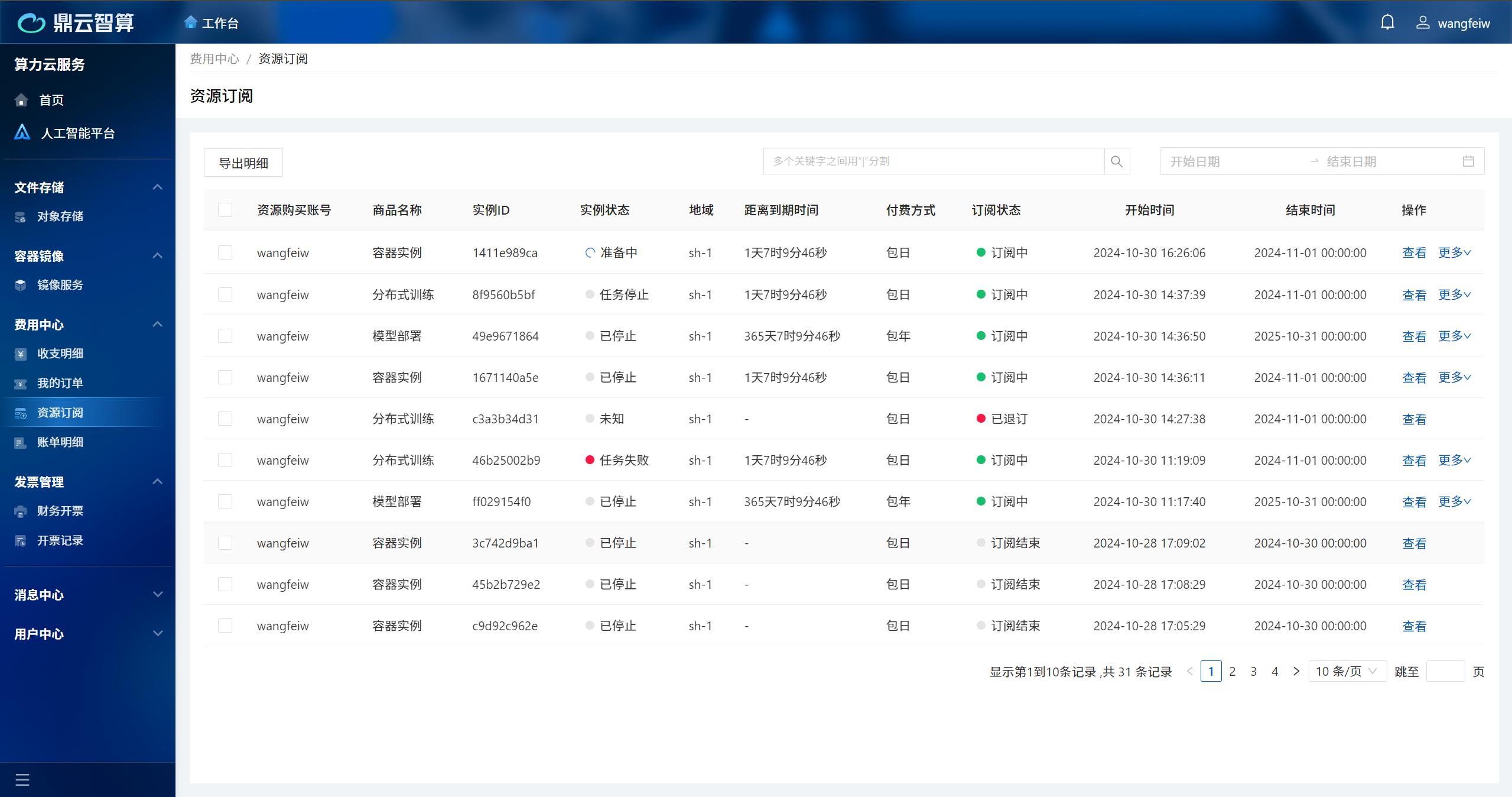 在左侧菜单栏,点击“资源订阅”标签页,跳转至资源订阅列表页,显示当前账户下订阅的详情,如下图所示: