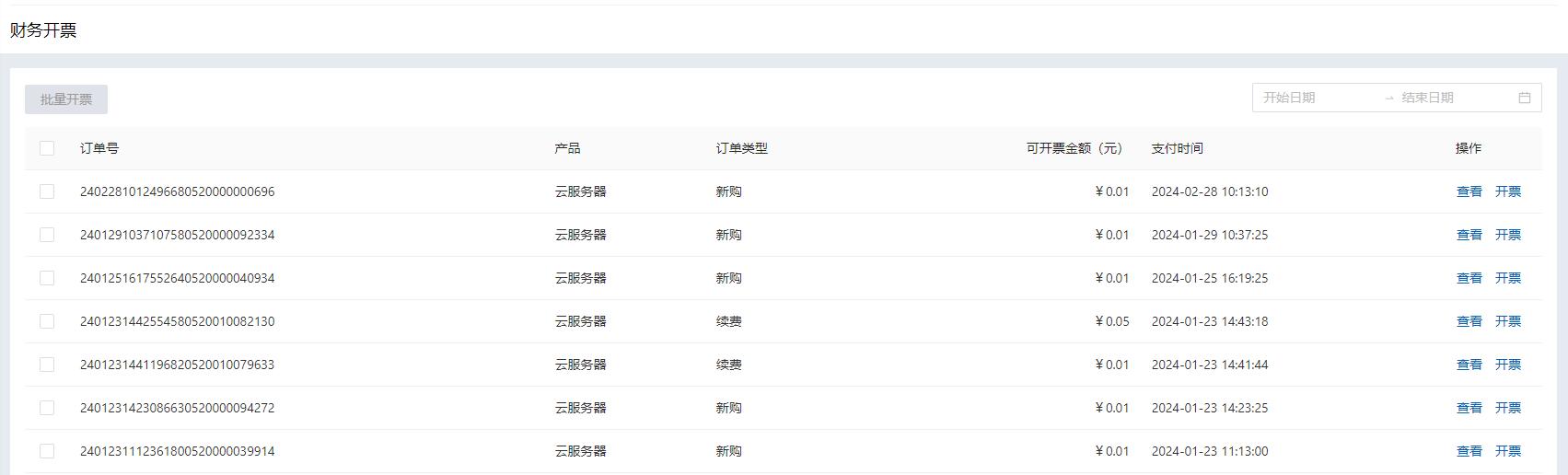 在左侧菜单栏,点击“财务开票”标签页,跳转至财务开票列表页,显示当前账户下所有可开票的订单,支持单个订单开票及批量开票,如下图: