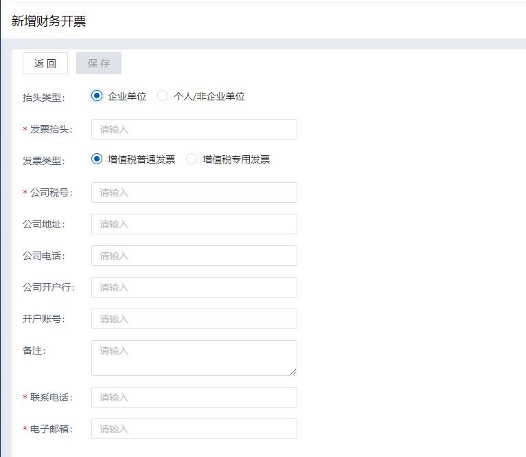 在财务开票列表页,点击“开票”按钮,进入财务开票页。用户填写开票所需的信息,点击保存,即可提交开票申请,后台通过后即开票成功。