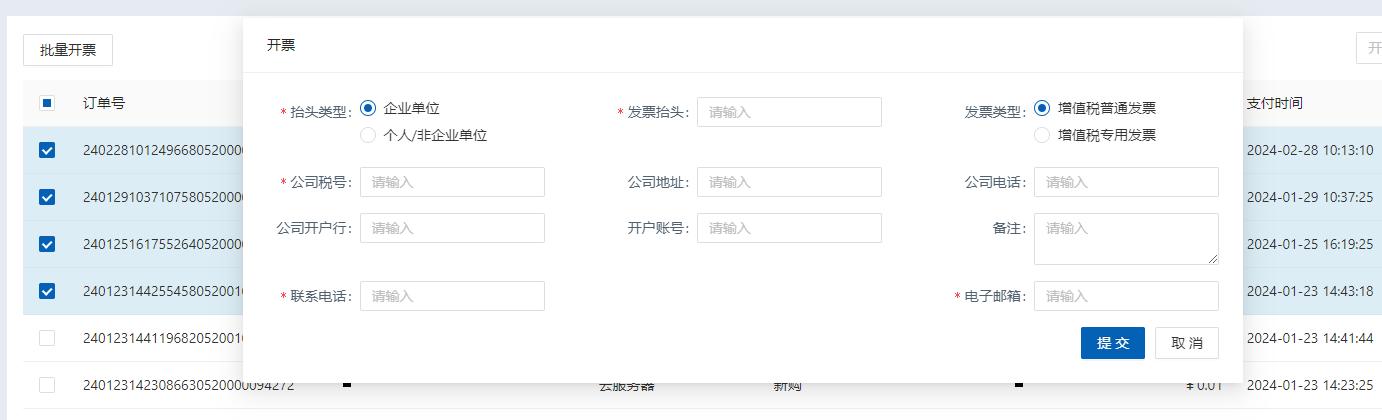 在财务开票列表页,选择多个订单,点击“批量开票”按钮,弹出开票弹框。用户填写开票所需的信息,点击保存,即可提交开票申请,后台通过后即开票成功。