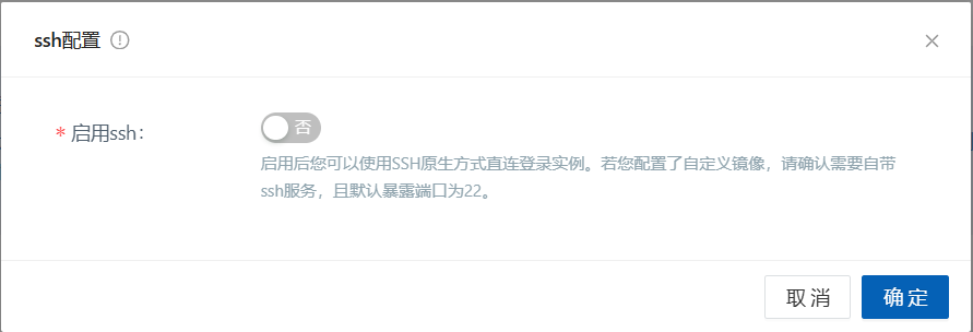 对于实例记录,点击列表操作栏内的“配置ssh”按钮,即可开启/关闭SSH的配置。