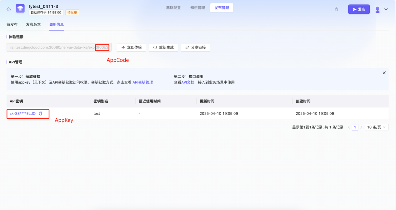 在应用管理界面,找到您处于运行中的应用(需要先发布),单击发布管理,会弹出“调用信息”窗口。可在图示查找AppKey和AppCode。