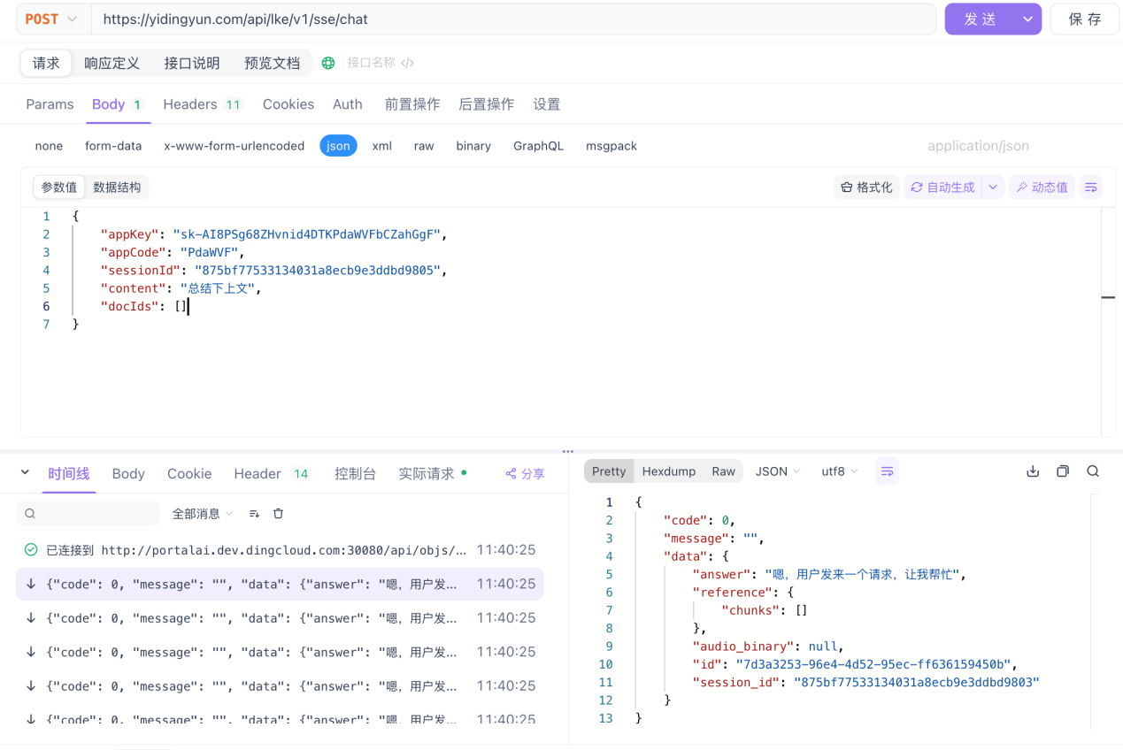 | sessionId | string(64) | 是 | 会话 ID,用于标识一个会话(外部系统提供,建议不同的用户端会话传入不同的 session_id,否则同一个应用下的不同用户的消息记录会串掉) 参数长度:2-64个字符 校验规则: ^[a-zA-Z0-9_-]{2,64}$ ,一般可以用 uuid 来生成该值 uuid 示例:1b9c0b03-dc83-47ac-8394-b366e3ea67ef |