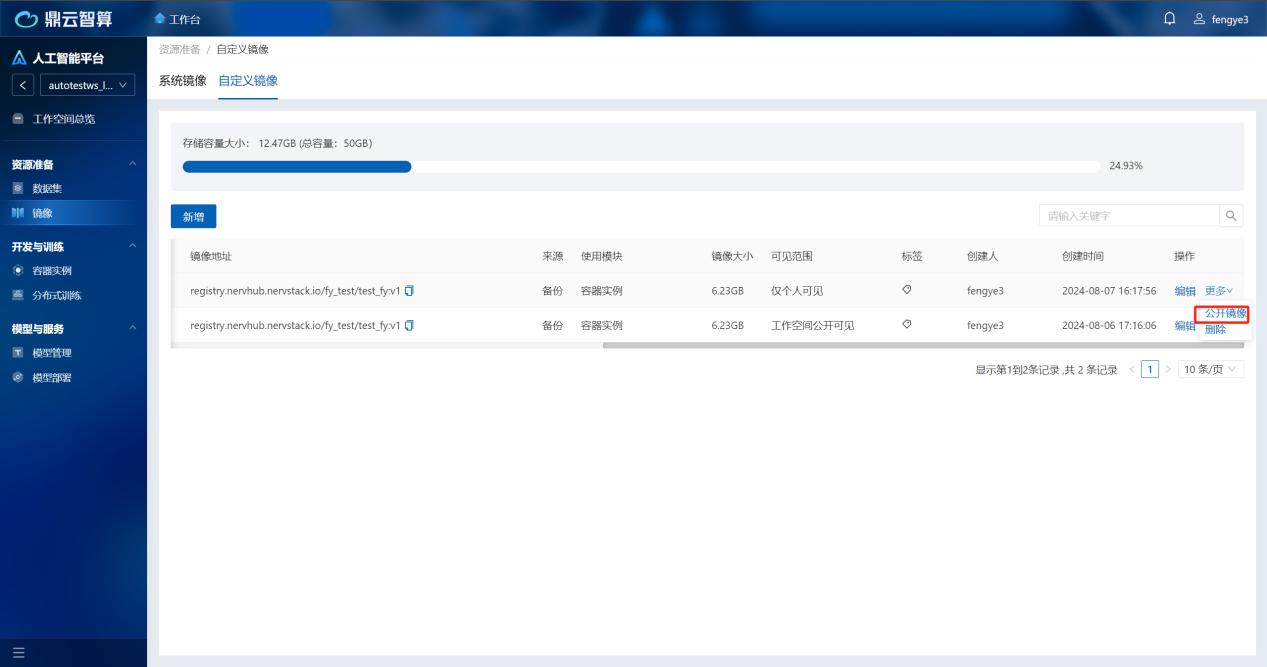 对于仅个人可见的自定义镜像,可以点击列表记录操作栏的“公开镜像”按钮,如下图所示: